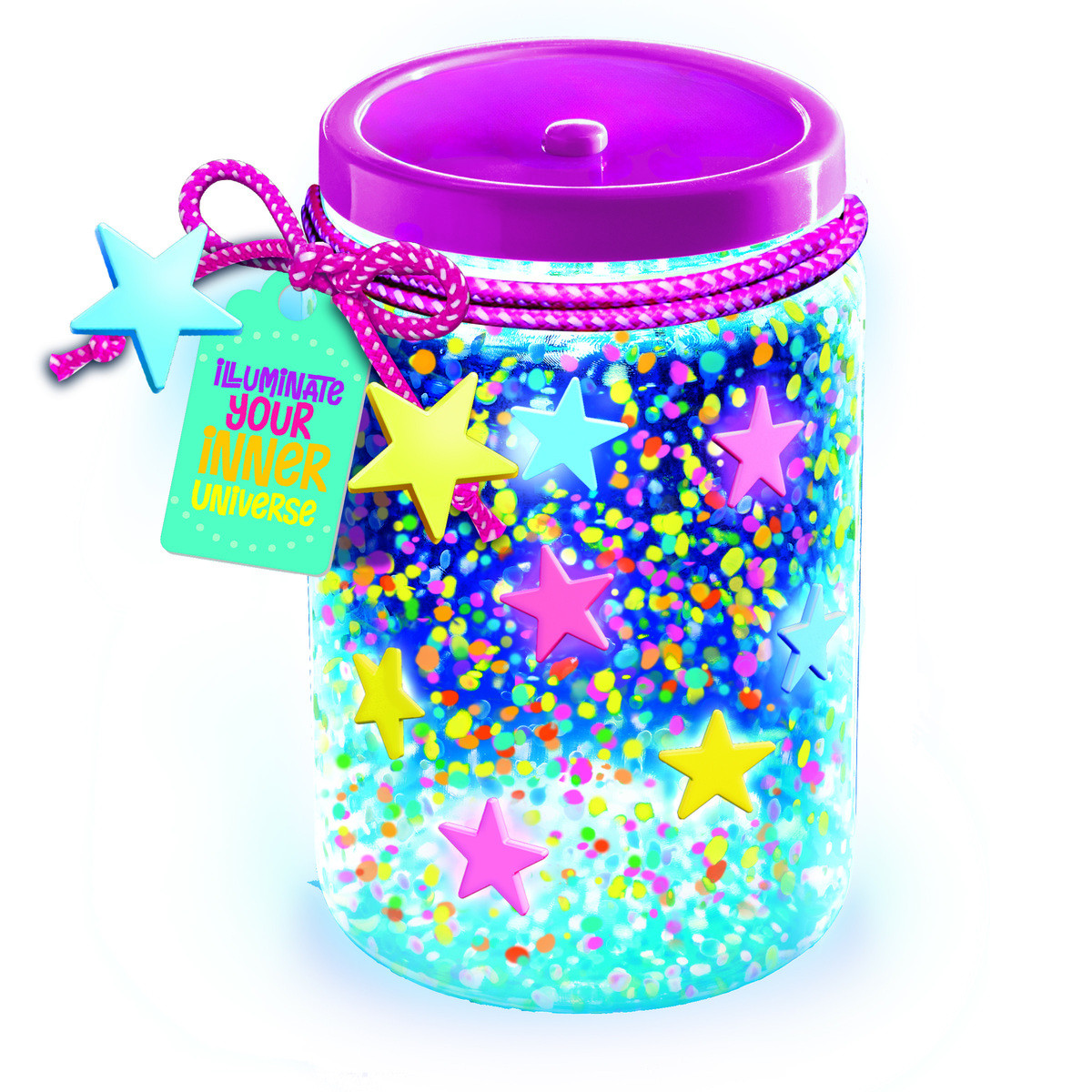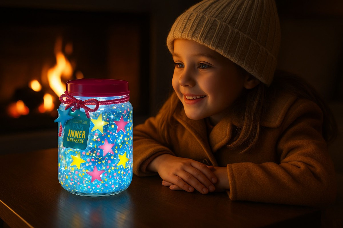 Με φωσφορίζοντα αστέρια, λαμπερά χρώματα και LED καπάκι, το βάζο φωτίζεται απαλά στο σκοτάδι, δημιουργώντας μια ζεστή και ονειρική ατμόσφαιρα. Μπορεί να τοποθετηθεί στο γραφείο, το κομοδίνο ή να κρεμαστεί, λειτουργώντας ως φωτιστικό αλλά και ως διακοσμητικό αντικείμενο.