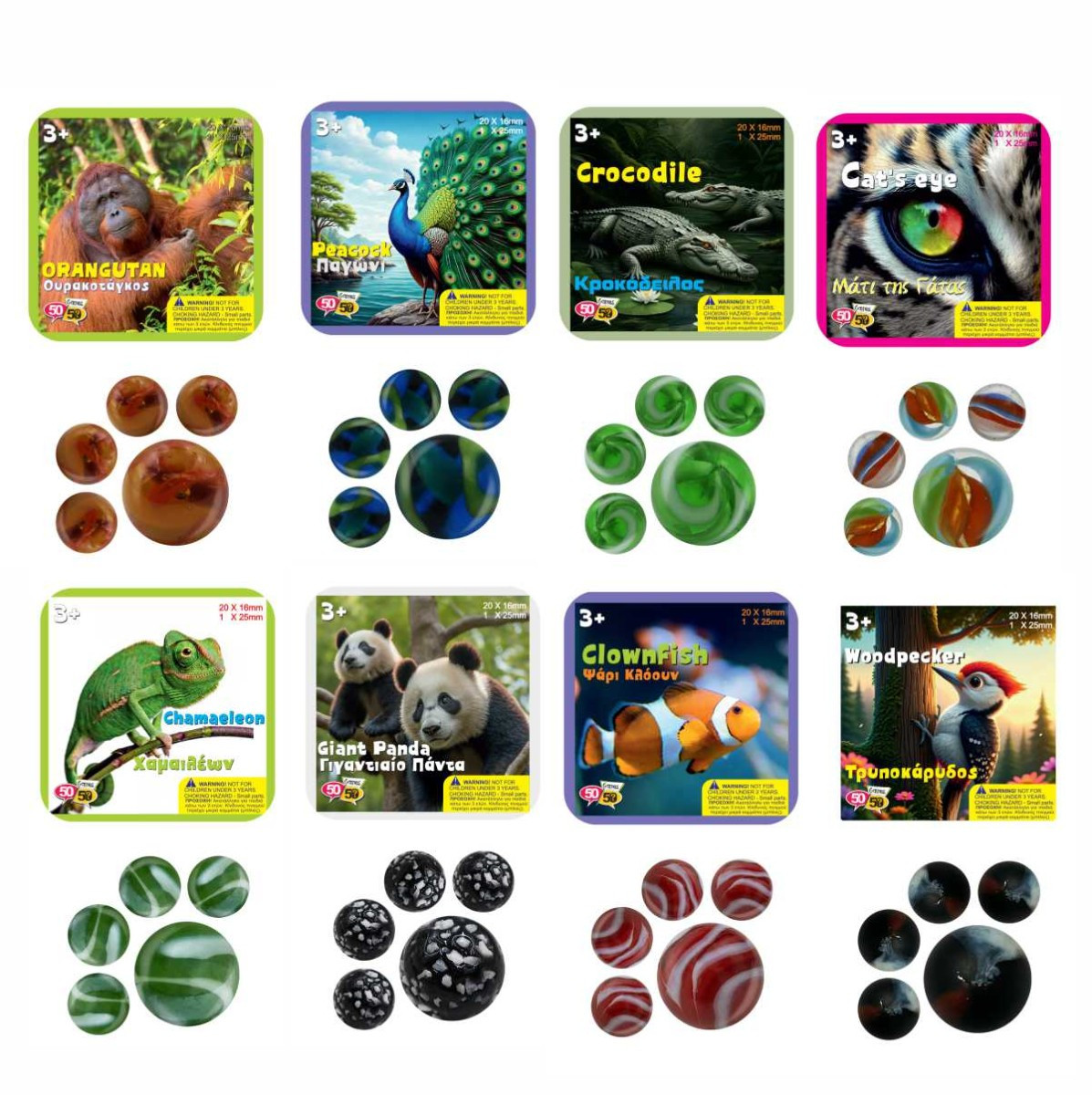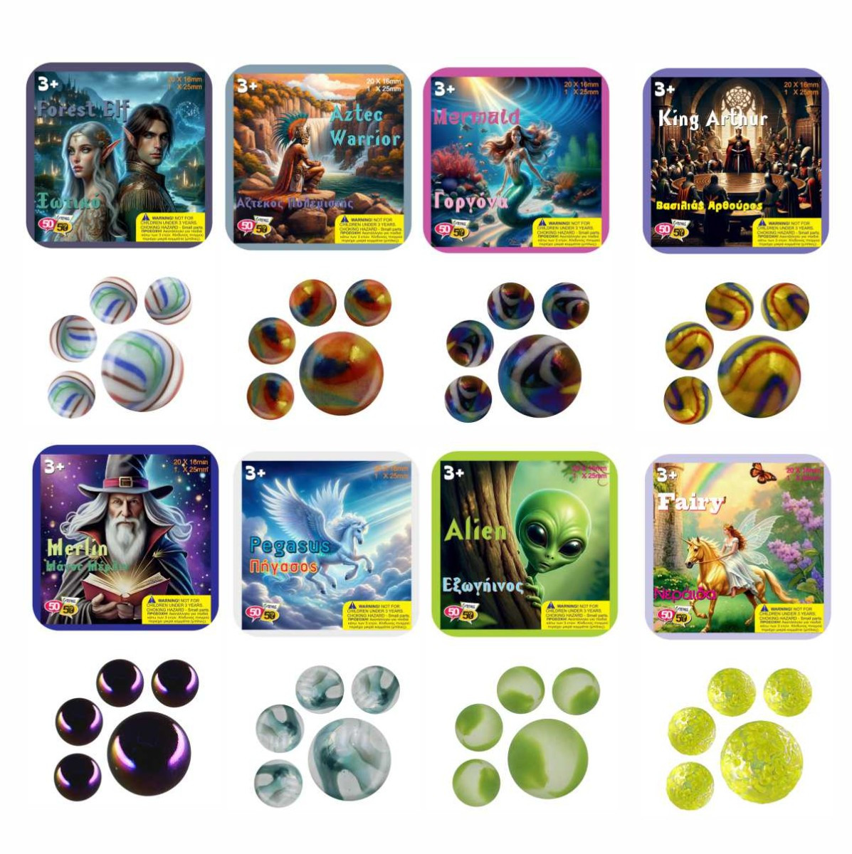 Με πάνω από 70 διαφορετικά σχέδια και χρώματα, κάθε σετ είναι τυχαίας επιλογής, κάνοντας κάθε αγορά μοναδική. Οι βόλοι ξεχωρίζουν για τη λάμψη τους, τα εντυπωσιακά μοτίβα και την προσεγμένη κατασκευή από 100% γυαλί, θυμίζοντας μικρά έργα τέχνης.