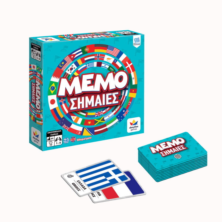 Το επιτραπέζιο ''Memo Σημαίες'' είναι ένα χαρούμενο και εκπαιδευτικό παιχνίδι μνήμης που βοηθά παιδιά και ενήλικες να αναγνωρίζουν τις σημαίες των χωρών του κόσμου. Με κάρτες υψηλής ποιότητας και δύο τρόπους παιχνιδιού, οι παίκτες μπορούν είτε να βρουν τα σωστά ζευγάρια είτε να αναγνωρίσουν τη σημαία και τη χώρα προέλευσής της.