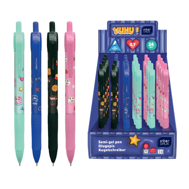Το Interdruk Στυλό YUHU Semi Gel 0.7mm προσφέρει ομαλή και άνετη γραφή χάρη στη semi-gel μύτη του. Διατίθεται σε μια σειρά από παιχνιδιάρικα και χρωματιστά σχέδια, κάνοντάς το ιδανικό για μαθητές και καθημερινή χρήση. Αποστέλλεται σε τυχαίο σχέδιο.