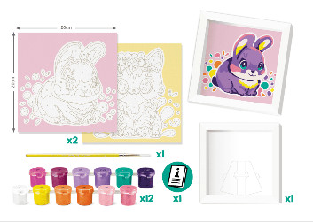 Το σετ διαθέτει όλα όσα χρειάζεται ένα παιδί για να δημιουργήσει μόνο του δύο ολοκληρωμένα έργα ζωγραφικής: