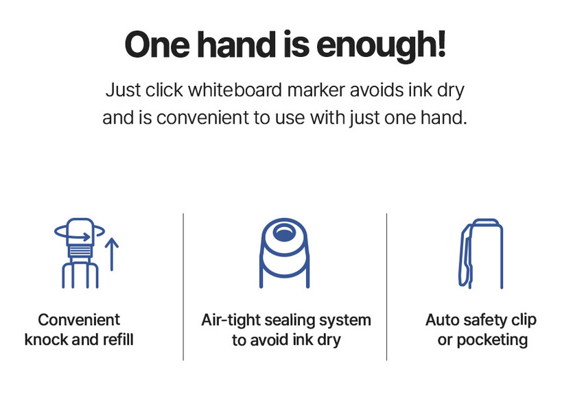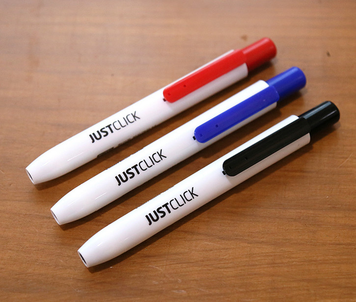 Ο καινοτόμος μηχανισμός JustClick επιτρέπει τη χρήση με ένα μόνο χέρι, χωρίς καπάκι, αποτρέποντας το στέγνωμα του μελανιού και εξασφαλίζοντας μέγιστη ευκολία.