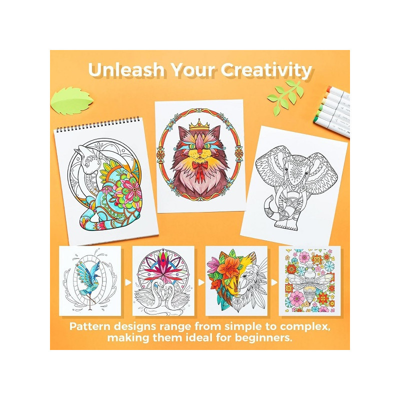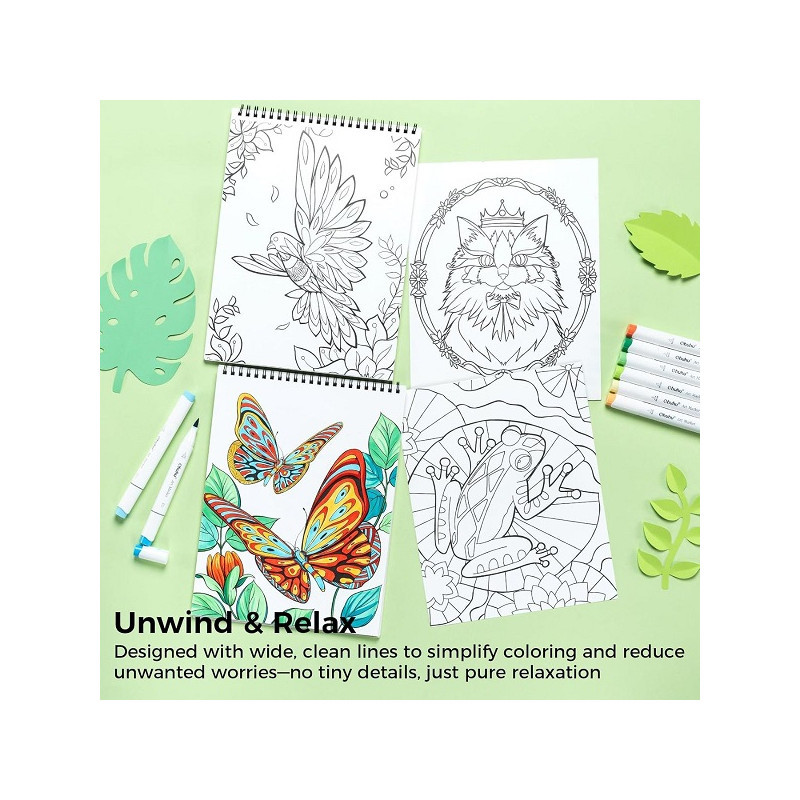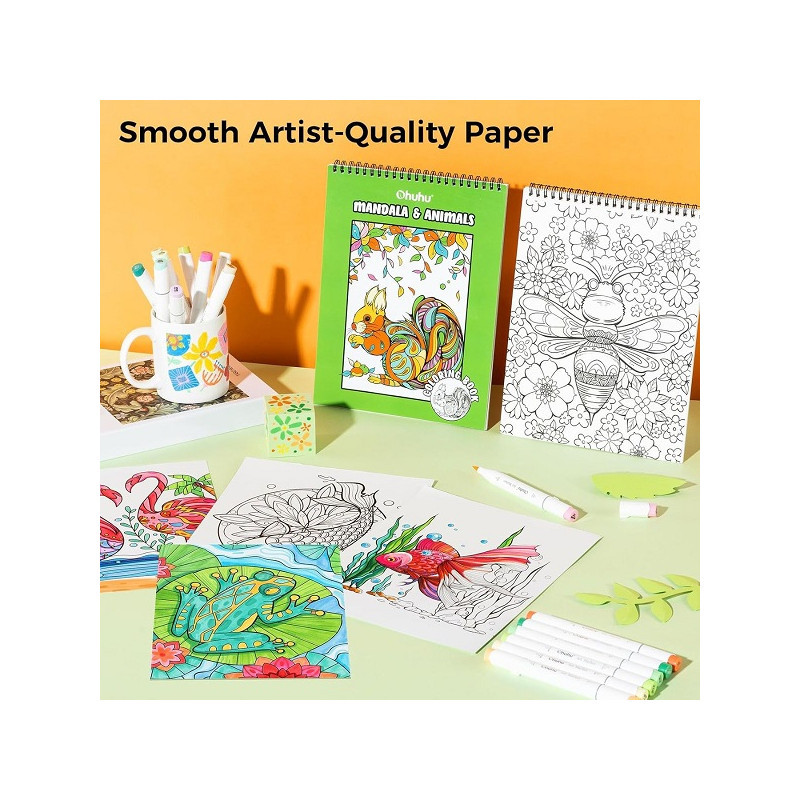 Το Ohuhu Mandala & Animals Coloring Book είναι ένα ποιοτικό μπλοκ ζωγραφικής σχεδιασμένο για χαλάρωση και δημιουργική έκφραση. Περιλαμβάνει 20 φύλλα (40 σελίδες) με μοναδικά σχέδια mandala και ζώων, τα οποία συνδυάζουν έντονες αλλά απλές γραμμές για απολαυστικό χρωματισμό χωρίς υπερβολικά περίπλοκες λεπτομέρειες.