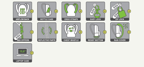 • Πλαϊνές θήκες με φερμουάρ και λάστιχο για παγούρι