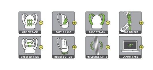 Σχεδιασμένο με γνώμονα την εργονομία και την ασφάλεια, διαθέτει ιμάντα στήθους με σφυρίχτρα, ανακλαστικές λεπτομέρειες, ανατομική πλάτη από εξειδικευμένα υλικά και ανθεκτικά SBS φερμουάρ. Ο ενισχυμένος, αδιάβροχος πάτος με 4 σημεία στήριξης εξασφαλίζει σταθερότητα και αντοχή, ακόμα και με βαρύ περιεχόμενο.