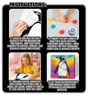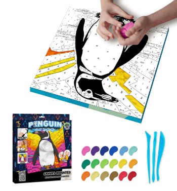 Το Splat Planet Ζωγραφική με Πηλό Penguin είναι ένα πρωτότυπο δημιουργικό σετ που συνδυάζει τέχνη, παιχνίδι και αισθητηριακή εμπειρία, προσφέροντας μια μοναδική δραστηριότητα χωρίς ακαταστασία. Ο προτυπωμένος καμβάς 30x30 ήδη τοποθετημένος σε πλαίσιο σας επιτρέπει να ξεκινήσετε άμεσα, ενώ τα μη τοξικά air-dry clay σε έντονα χρώματα δίνουν τη δυνατότητα να δημιουργήσετε εντυπωσιακά 3D σχέδια. Κάθε πηλός είναι αριθμημένος, ώστε να ταιριάζει εύκολα με το σχέδιο, διευκολύνοντας μικρούς και μεγάλους. Με τη χρήση των ειδικών εργαλείων διαμόρφωσης, μπορείτε να πλάσετε, να πιέσετε και να δημιουργήσετε μοναδικές υφές. Το αποτέλεσμα είναι ένα ανθεκτικό έργο τέχνης, έτοιμο για ανάρτηση, που συνδυάζει δημιουργικότητα και διασκέδαση.